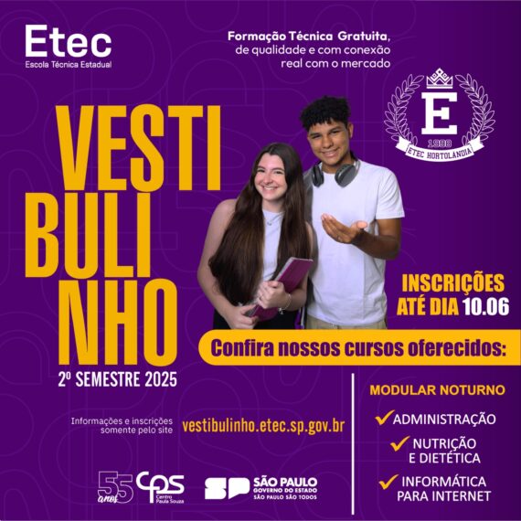 O seu futuro começa aqui! Estão abertas as inscrições para o Vestibulinho da Etec Hortolândia. Garanta sua vaga em uma formação técnica gratuita, de qualidade e com conexão real com o mercado de trabalho. Dê […]
